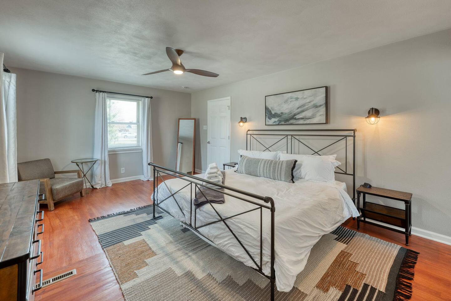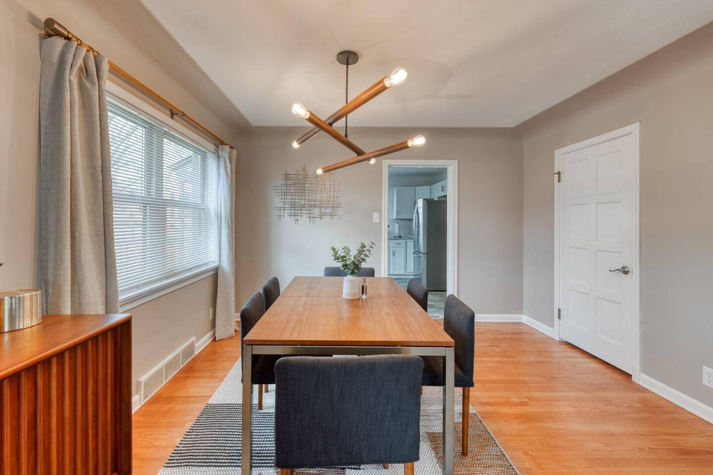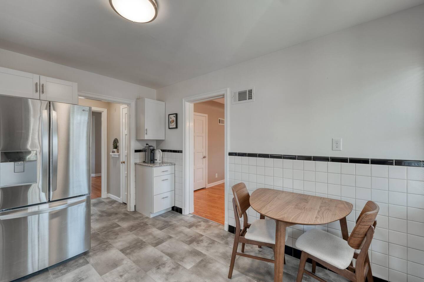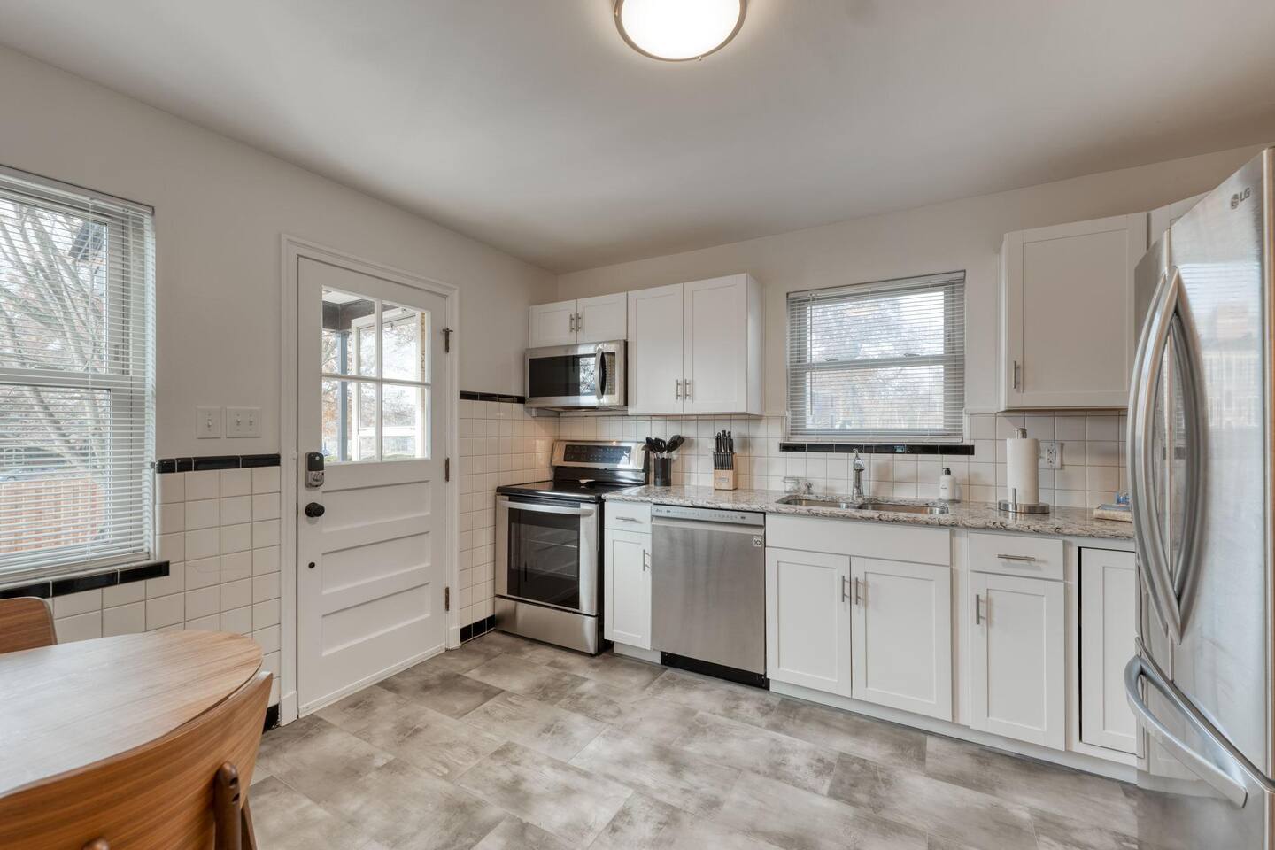 Modern amenities and updates make this midcentury home the perfect place to live and work while in Edwardsville. From the decorative original front door in the perfect downtown neighborhood to the completely renovated master bedroom ensuite, you'll be delighted by the charm and functionality of this home. The restored original hardwood is met with clean and updated paint & trim. Kitchen is newly renovated with beautiful Cambria countertops, a Nespresso coffee bar, and a cozy eat-in breakfast nook. The open concept dining room is a great gathering place with plenty of room to enjoy a special meal and chat. Working remotely? No problem! A dedicated office with printer and high-speed wifi is exactly what you need to work efficiently so you can enjoy more time downtown. In addition to the new master bath, two classically midcentury-style bathrooms are a throw back to days gone by. There is a fully fenced outdoor living space so feel free to enjoy your morning coffee or evening cocktail al fresco on the patio. Luxury mattresses and cotton hotel linens are in every room ensure you'll wake up feeling refreshed.