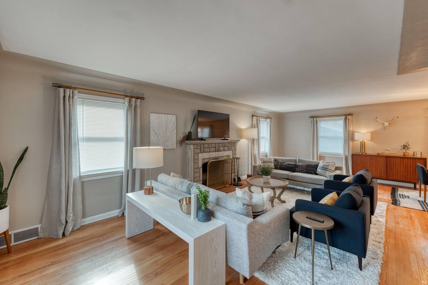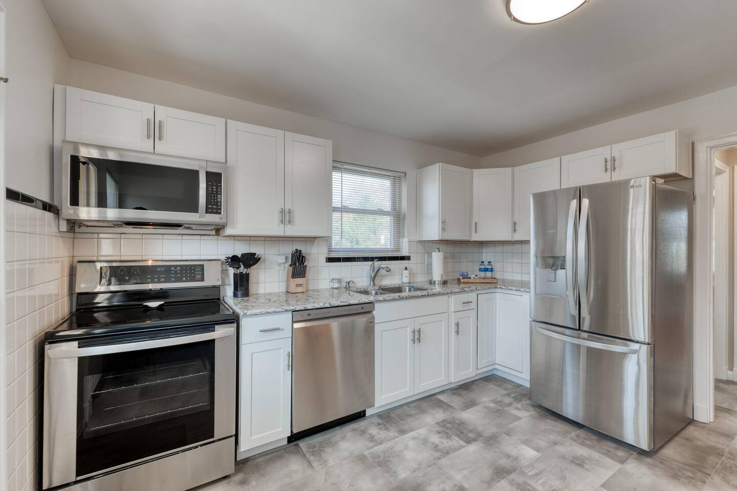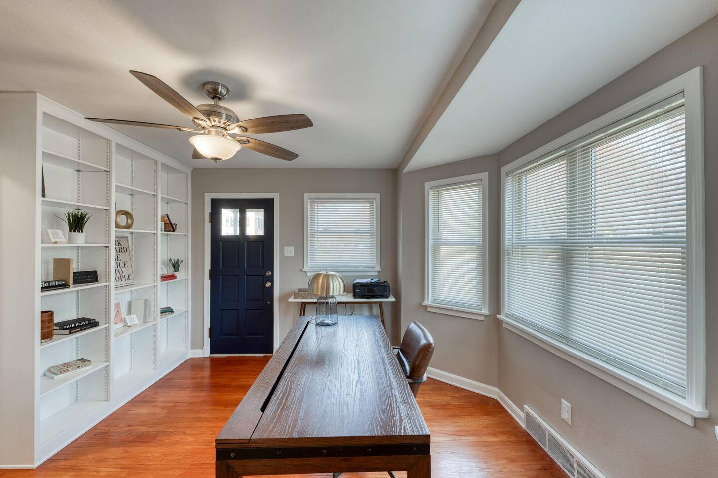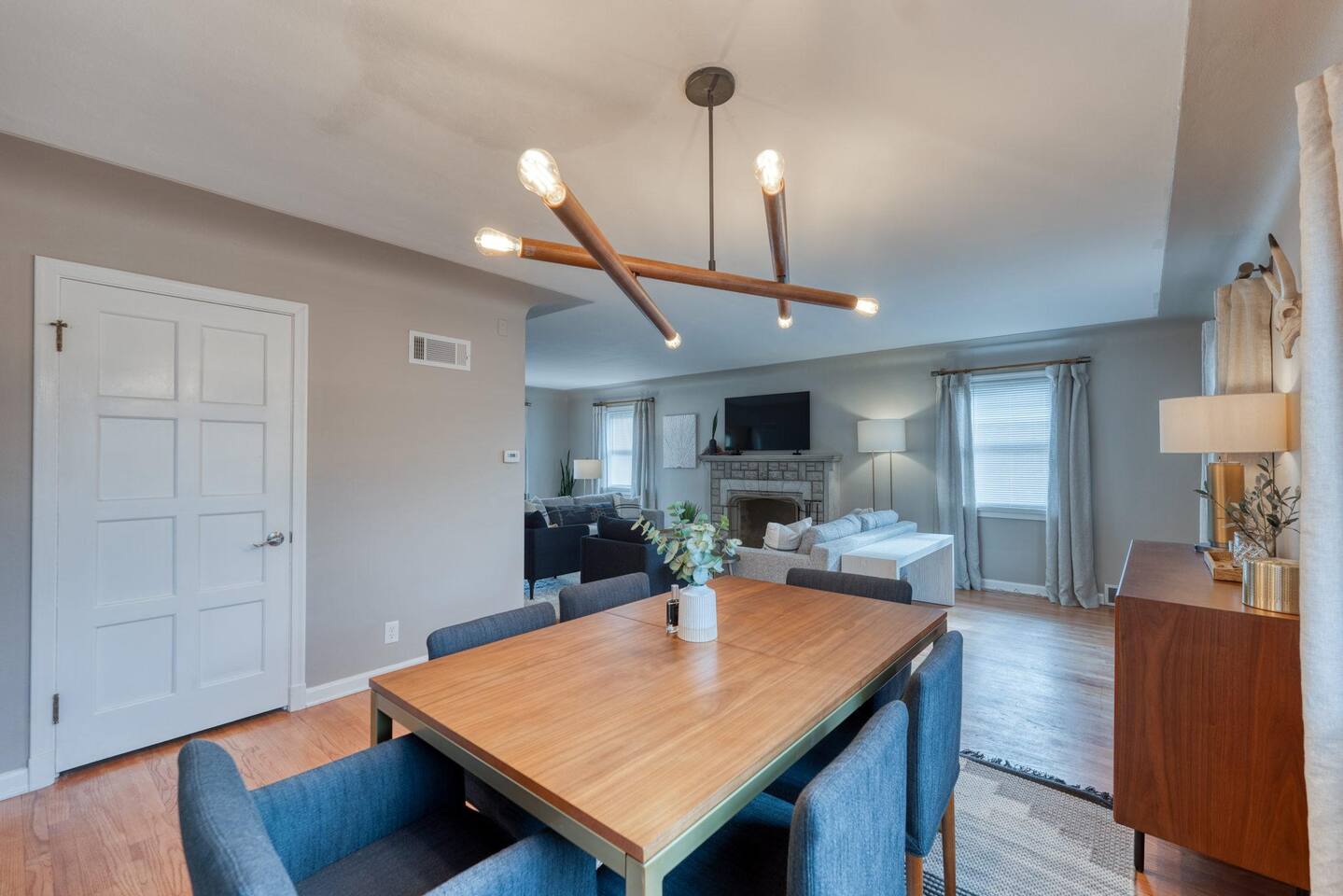 Modern amenities and updates make this midcentury home the perfect place to live and work while in Edwardsville. From the decorative original front door in the perfect downtown neighborhood to the completely renovated master bedroom ensuite, you'll be delighted by the charm and functionality of this home. The restored original hardwood is met with clean and updated paint & trim. Kitchen is newly renovated with beautiful Cambria countertops, a Nespresso coffee bar, and a cozy eat-in breakfast nook. The open concept dining room is a great gathering place with plenty of room to enjoy a special meal and chat. Working remotely? No problem! A dedicated office with printer and high-speed wifi is exactly what you need to work efficiently so you can enjoy more time downtown. In addition to the new master bath, two classically midcentury-style bathrooms are a throw back to days gone by. There is a fully fenced outdoor living space so feel free to enjoy your morning coffee or evening cocktail al fresco on the patio. Luxury mattresses and cotton hotel linens are in every room ensure you'll wake up feeling refreshed.